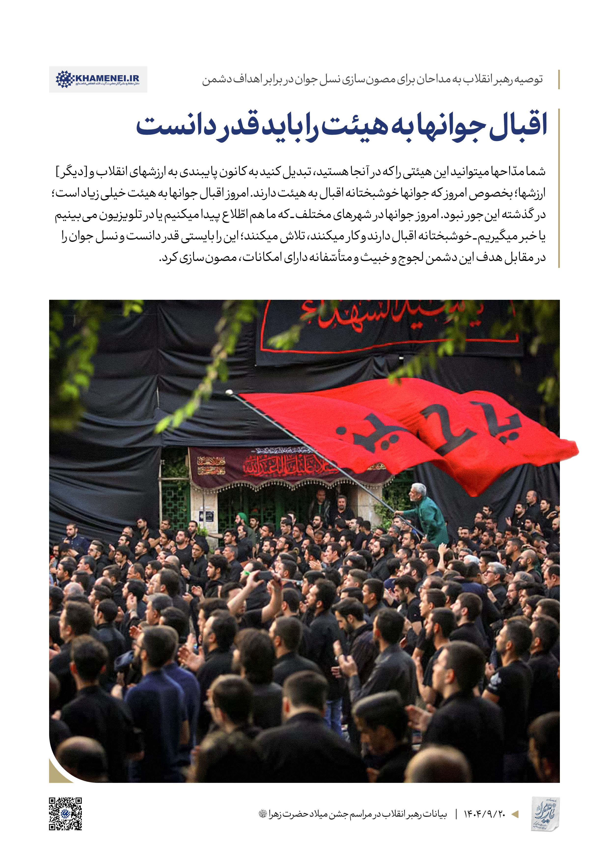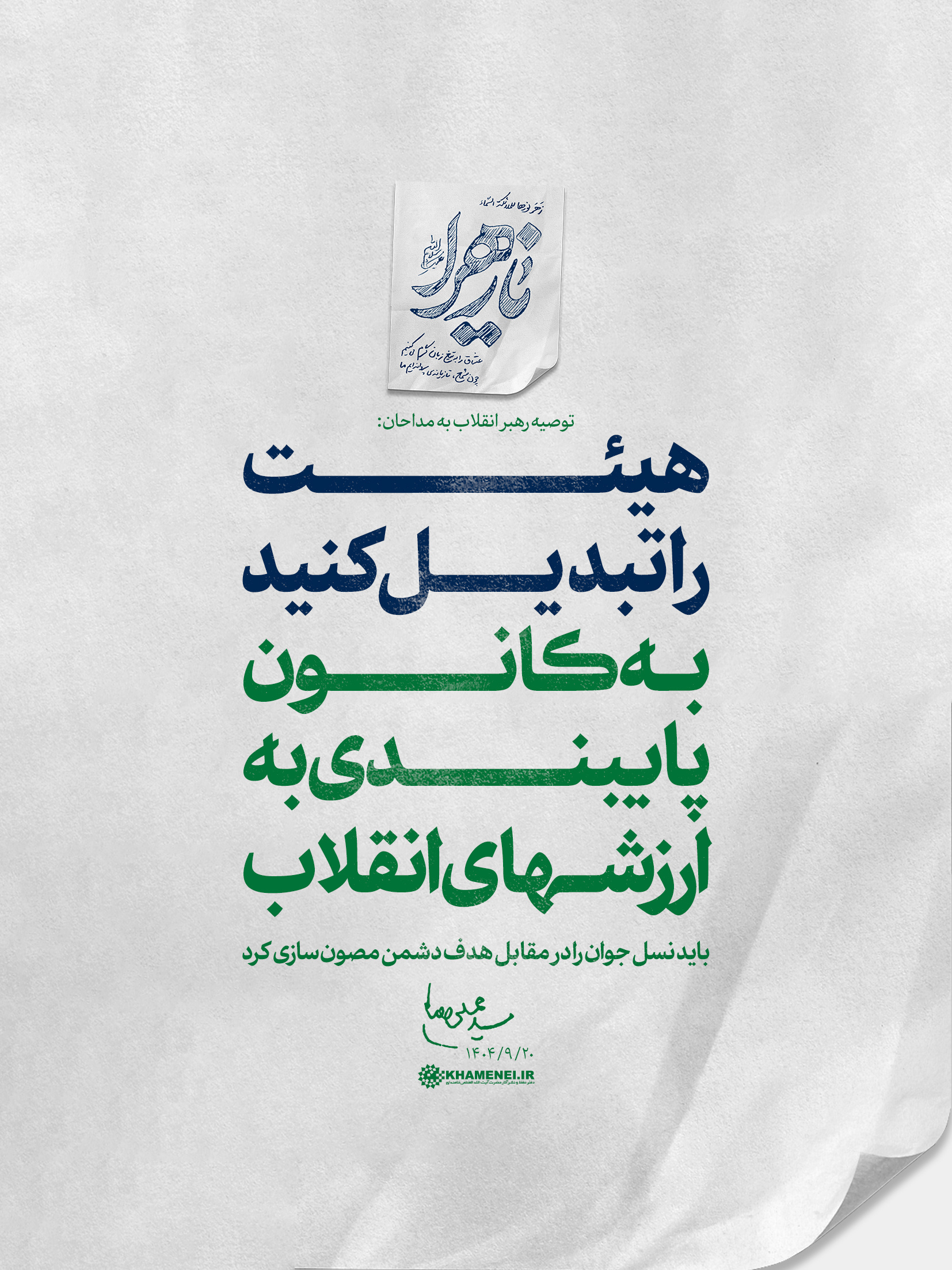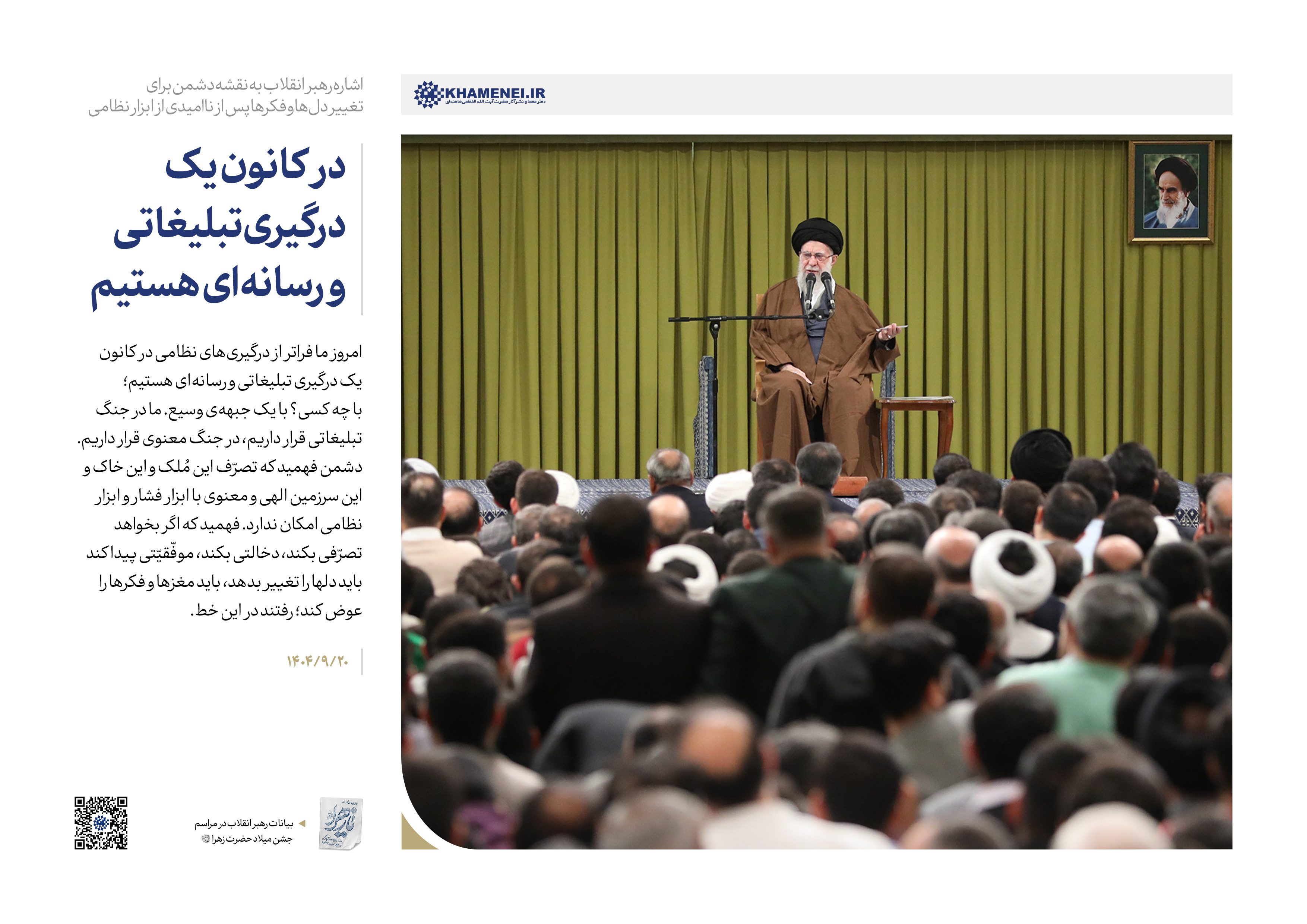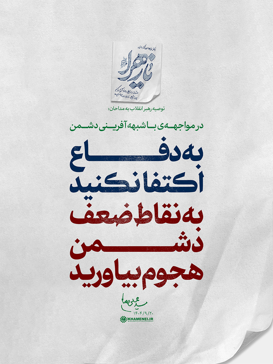 عزیزانم راه را غلط نروید راه همان است که رهبر فرزانه انقلاب حضرت آیه الله العظمی امام خامنهای ما را بر آن هدایت میکند هوشیار باشید که دشمن ریشه ما را هدف گرفته، چشم دشمن را هدف بگیرید ...