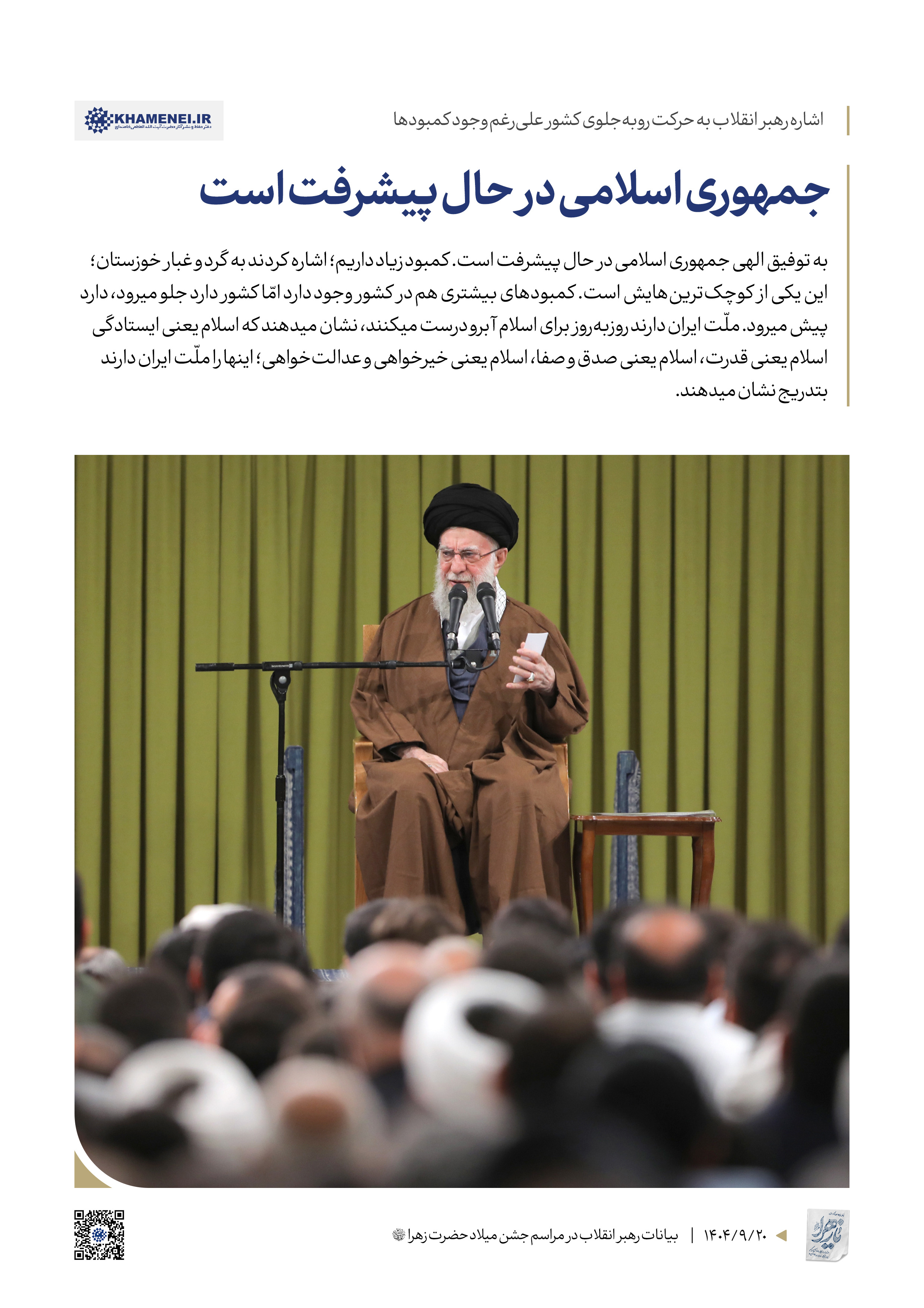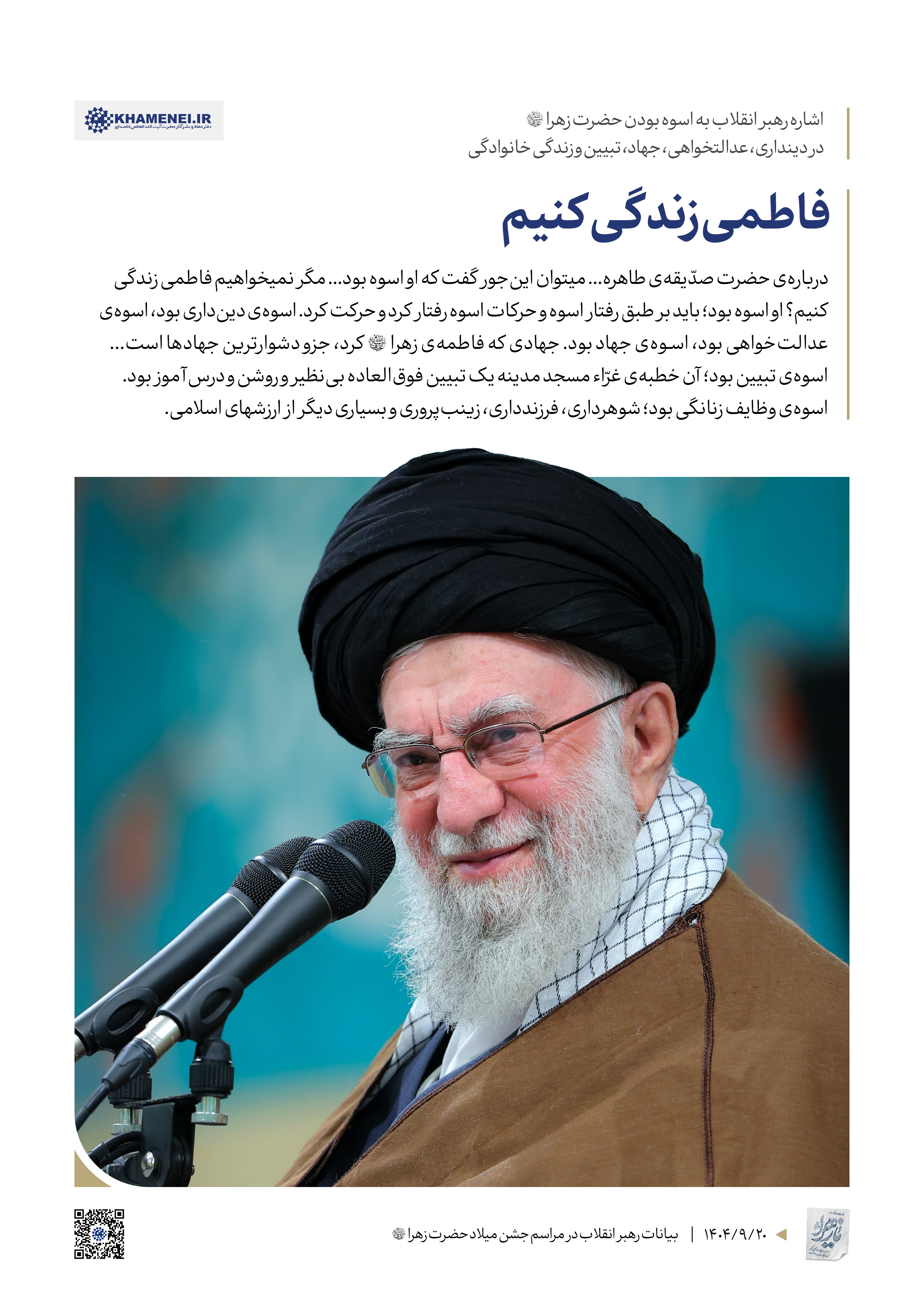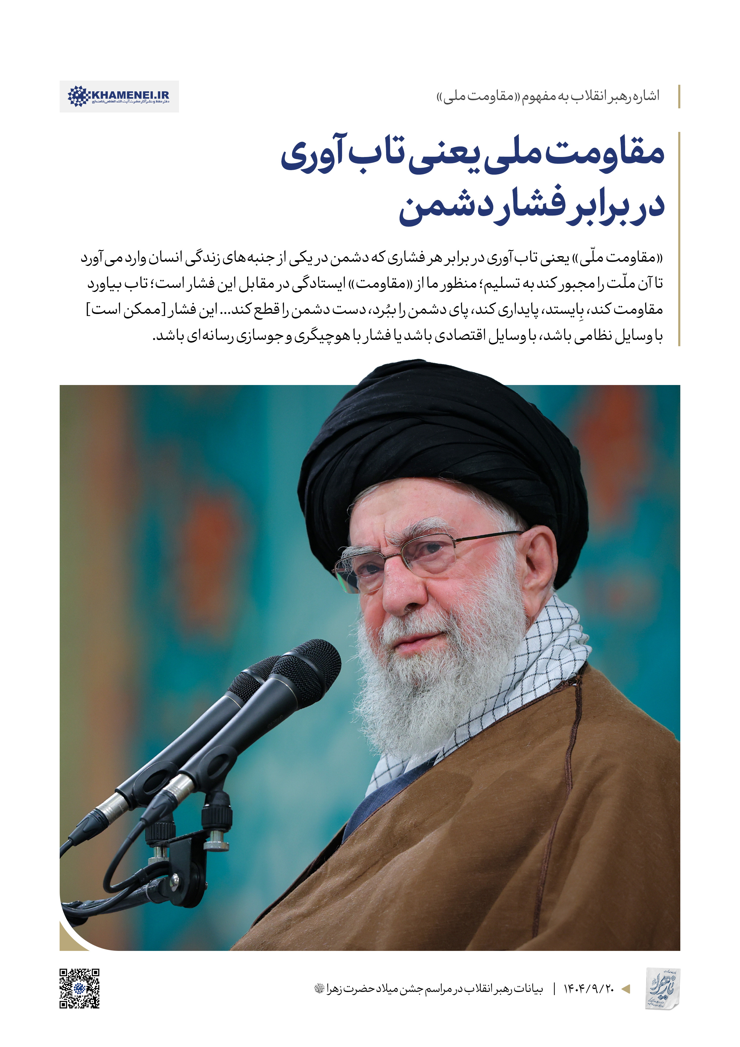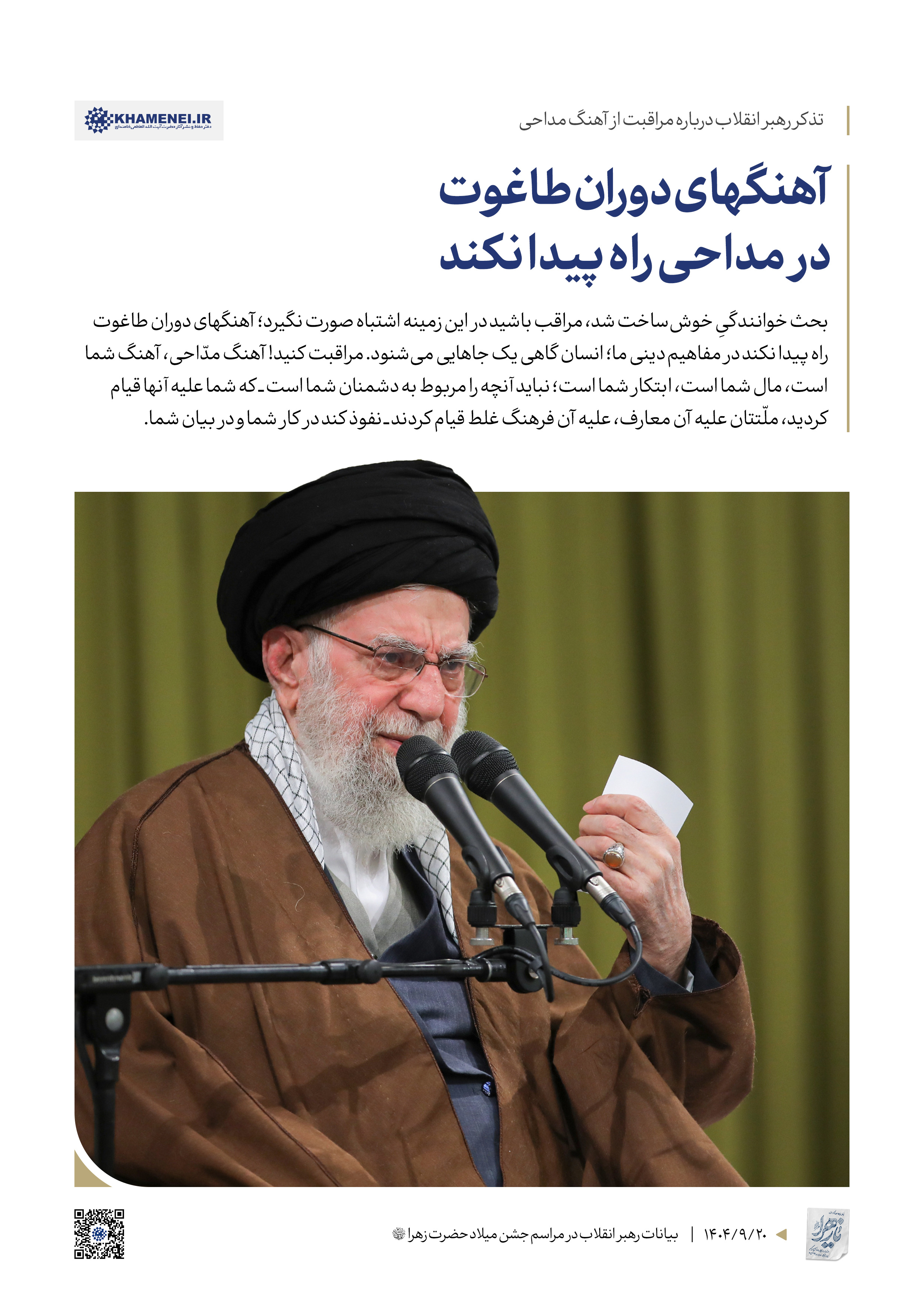 عزیزانم راه را غلط نروید راه همان است که رهبر فرزانه انقلاب حضرت آیه الله العظمی امام خامنهای ما را بر آن هدایت میکند هوشیار باشید که دشمن ریشه ما را هدف گرفته، چشم دشمن را هدف بگیرید ...